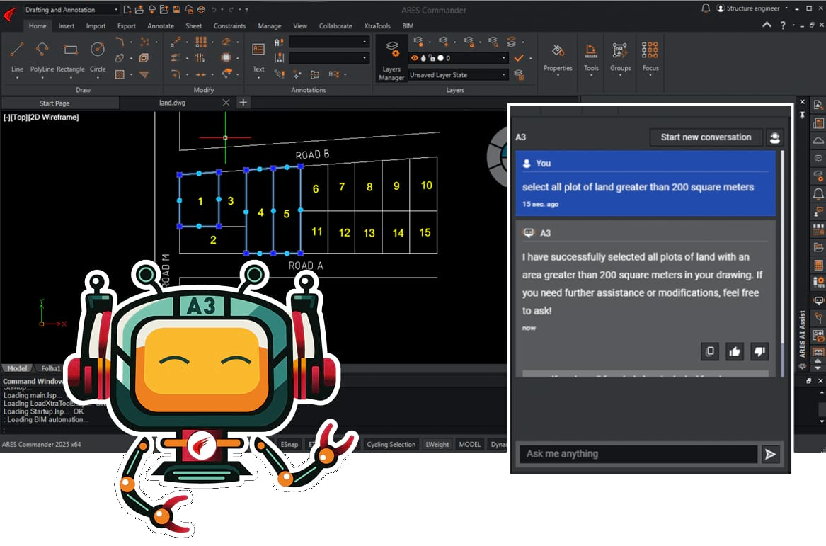 ![]() | 생산성을 높이는 AI 기반 기능ARES COMMANDER의 최신 버전에서는 ARES AI Assist(A3)라는 CAD 어시스턴트 기능이 도입되어 사용자가 자연어를 사용하여 도면을 제어할 수 있습니다. 예를 들어, "선택한 요소의 색상을 빨간색으로 변경" 또는 "Construction 레이어의 모든 선을 선택"과 같은 명령을 입력하면 A3가 이를 실행합니다.