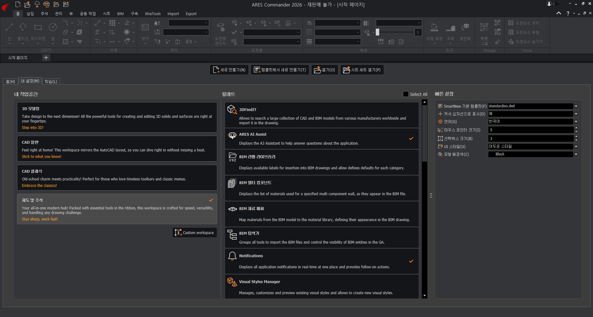 AutoCAD 또는 유사한 CAD 애플리케이션에서 전환한 새로운 사용자는 작업 공간을 자신에게 맞게 설정하면 ARES Commander에서 빠르게 적응할 수 있습니다. 이 과정을 간편하게 하기 위해, 마법사는 팔레트 및 기타 옵션 선택을 돕습니다. 또한, ‘CAD 일반’ 작업 공간은 기본적으로 활성화되어 있어 처음부터 익숙한 환경을 제공합니다. |