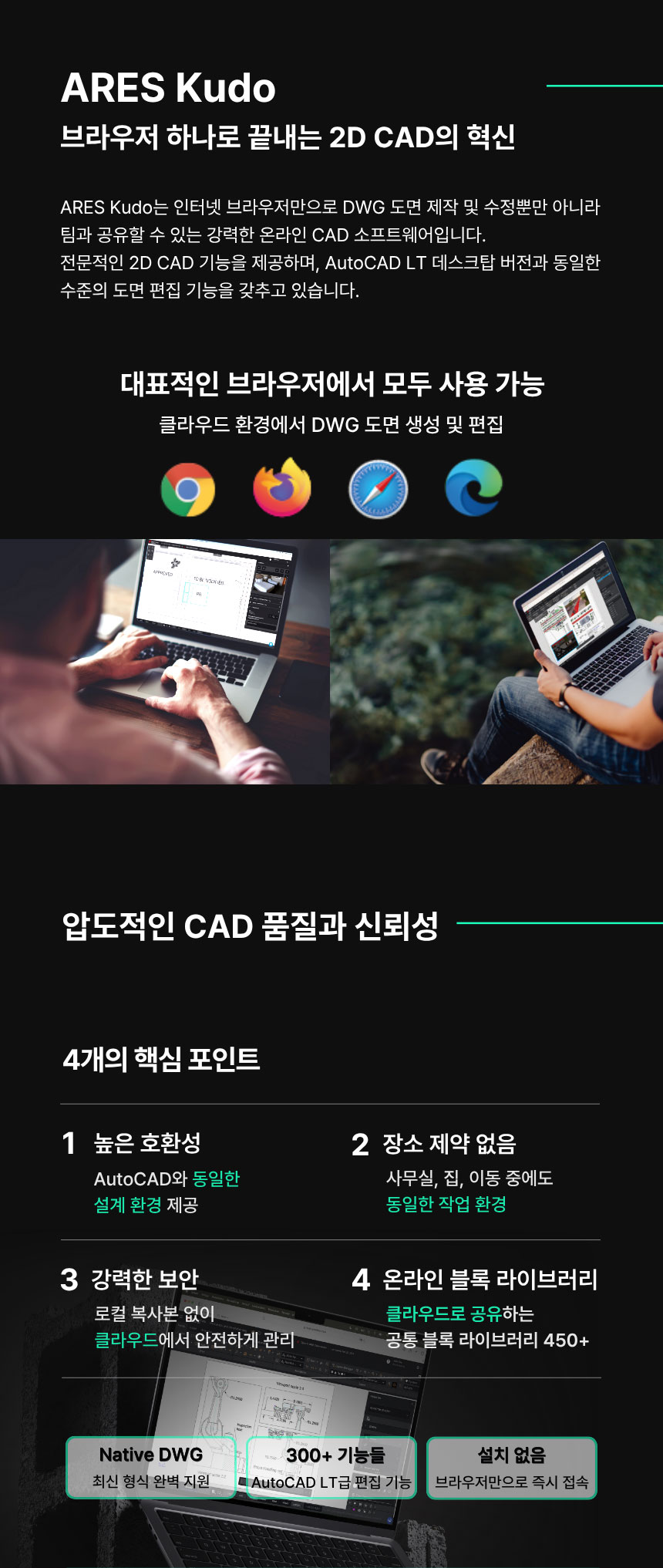 - ARES Kudo는 클라우드 기반 버전으로 인터넷 브라우저 내에서 도면 생성, 수정, 편집 작업이 직접 실행되는 구독형 최신 CAD 애플리케이션